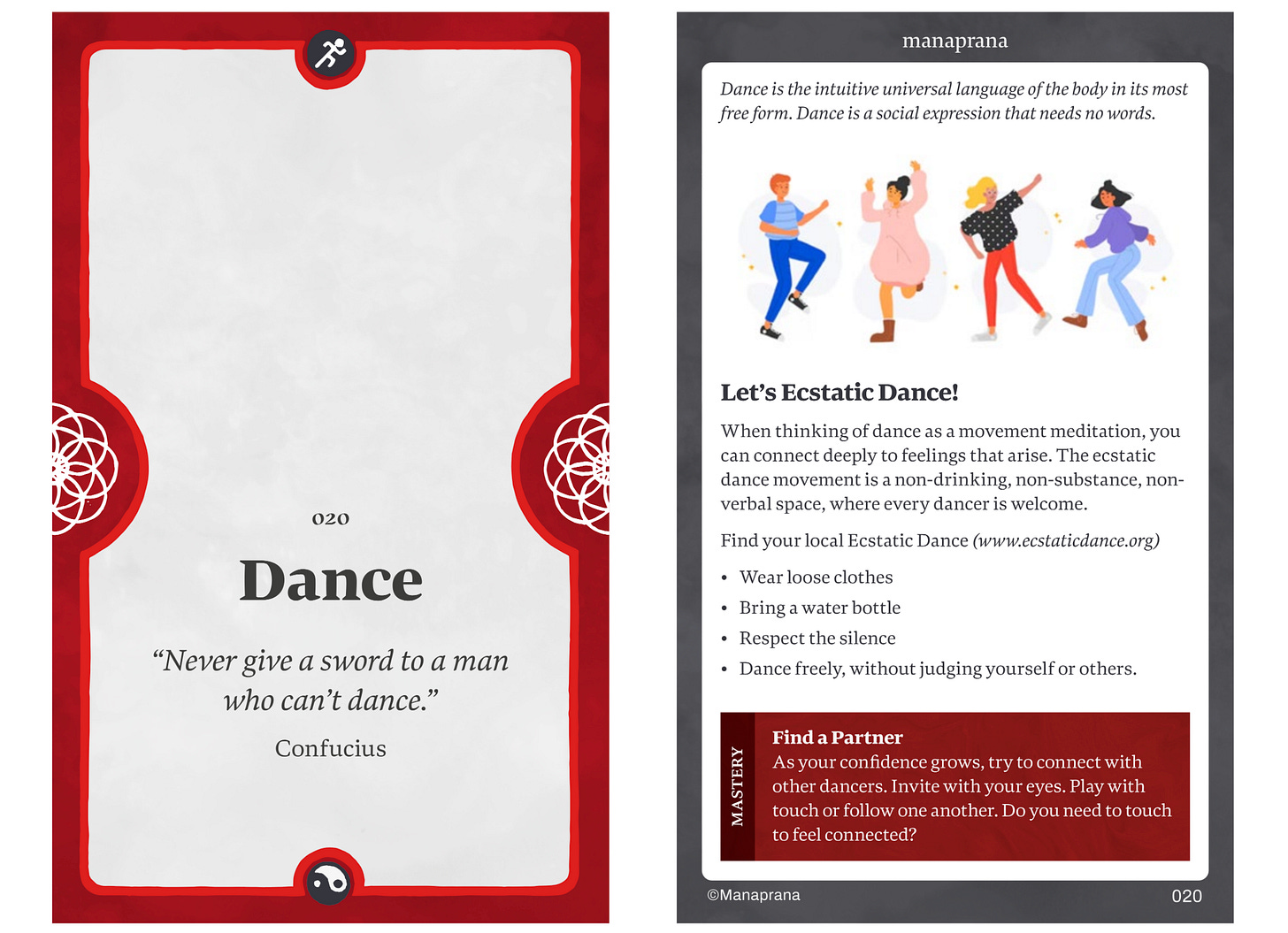 Card number 020 is Dance. It’s a yang card, which encourages you to put energy out into your environment. It’s also primarily associated with body, health, and svadhisthana (the 2nd chakra, water, and creativity). All the cards have different associations, and you can take whatever meaning you want as you read the cards. On the back of every card are carefully designed workshops to help you feel and express the card by doing something yourself. The Dance card workshop encourages you to go and try an ecstatic dance.